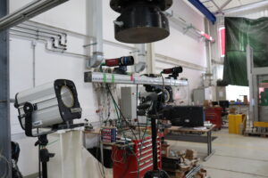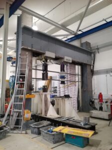 Portalrahmen mit zwei hydraulischen Zylindern für mechanische Untersuchungen an mittleren und großen Bauteilen (Hauptzylinder 2100 kN in Druck und dynamischer Zylinder 500 kN Zug/Druck bei maximaler Prüffrequenz von ca 6 Hz),sowie ein verstärktes Prüffeld zur Lastabtragung (~5 m x 10 m)