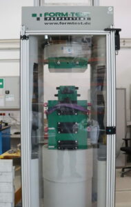 hydraulischem Zylinder für hochfeste Material- und Kleinkörperversuche, mit einer maximalen Prüflast von 5000 kN und mit maximalen Abmessungen von 0,65 m in Höhe und 0,5 m in Länge und Breite